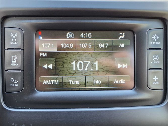 Seek scan: Seek scan. RDS: Radio data system (RDS). Aux input jack: Auxiliary input jack. External memory: External memory control. Voice activated audio: Voice activated audio controls. Wireless streaming: Bluetooth wireless audio streaming. Number of first-row screens: 1 total number of 1st row displays. Primary display size: 5 inch primary display. Primary display touchscreen: Primary monitor touchscreen. Handsfree: Uconnect w/Bluetooth handsfree wireless device connectivity. Radio: AM/FM.